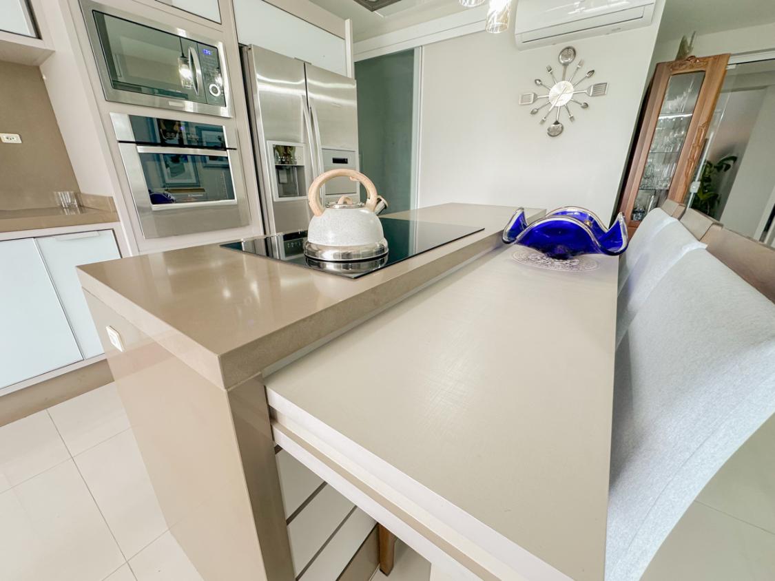 Para ocasiões especiais, a churrasqueira integrada à cozinha favorece a convivência e transforma cada refeição em uma celebração. O terraço privativo, banhado pela luz natural e pela brisa suave do litoral, é um refúgio versátil para relaxar, cultivar plantas ou simplesmente contemplar o céu.